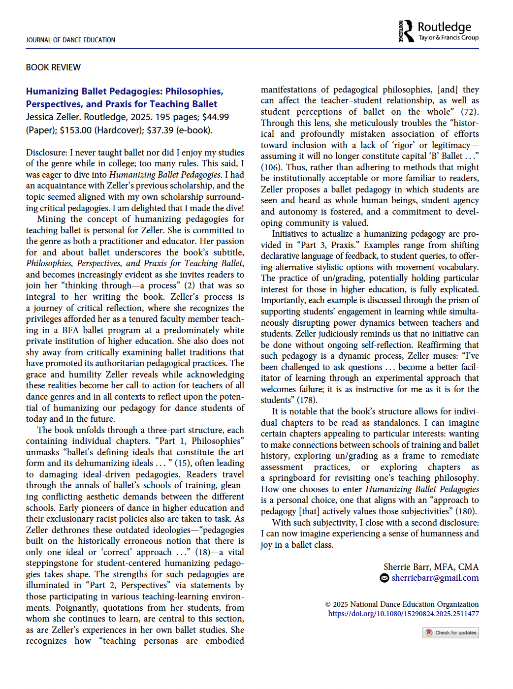 “Mining the concept of humanizing pedagogies for teaching ballet is personal for Zeller. She is committed to the genre as both a practitioner and educator. Her passion for and about ballet underscores the book’s subtitle, Philosophies, Perspectives, and Praxis for Teaching Ballet, and becomes increasingly evident as she invites readers to join her “thinking through—a process” (2) that was so integral to her writing the book. Zeller’s process is a journey of critical reflection, where she recognizes the privileges afforded her as a tenured faculty member teaching in a BFA ballet program at a predominately white private institution of higher education. She also does not shy away from critically examining ballet traditions that have promoted its authoritarian pedagogical practices. The grace and humility Zeller reveals while acknowledging these realities become her call-to-action for teachers of all dance genres and in all contexts to reflect upon the potential of humanizing our pedagogy for dance students of today and in the future.”