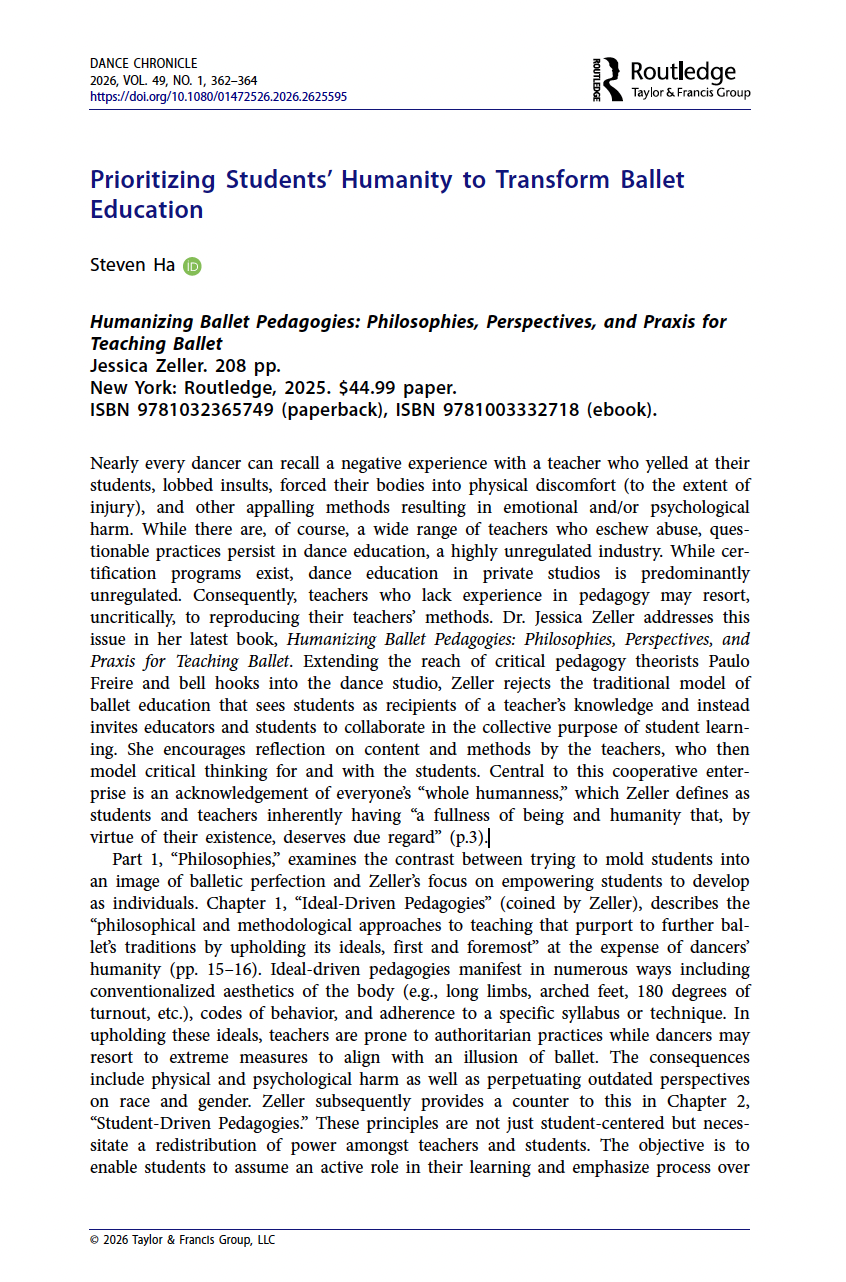 “Extending the reach of critical pedagogy theorists Paulo Freire and bell hooks into the dance studio, Zeller rejects the traditional model of ballet education that sees students as recipients of a teacher’s knowledge and instead invites educators and students to collaborate in the collective purpose of student learning. She encourages reflection on content and methods by the teachers, who then model critical thinking for and with the students. Central to this cooperative enterprise is an acknowledgement of everyone’s ‘whole humanness,’ which Zeller defines as students and teachers inherently having ‘a fullness of being and humanity that, by virtue of their existence, deserves due regard’ (p.3).” —Dr. Steven Ha